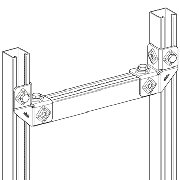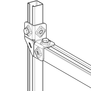 Verbindungselement für Rahmenkonstruktionen aus Montageschienen. Je nach Anwendung kann die Öffnung der Montageschiene ausgerichtet werden.